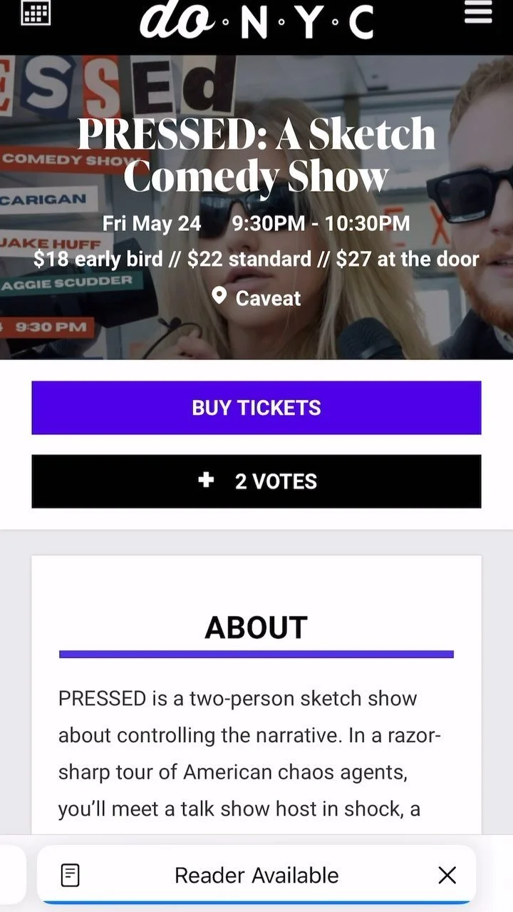 Listed as one of Time Out New Yorkβs βBest Things to Do This Weekendβ in May 2024, PRESSED is a two-person sketch show about controlling the narrative. In a razor-sharp tour of American chaos agents, youβll meet a talk show host in shock, a fallen starlet who canβt tapdance, and a volunteer sea marshal answering the call of duty. As sketches begin to crash into one another (literally!), youβll realize that at the end of the day, itβs not about who was right β itβs about who grabbed the mic first.