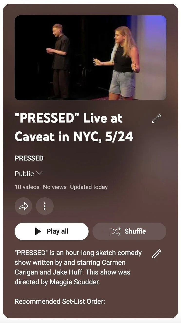 Carmen Carigan and Jake Huff are New York-based comedians who began writing together on a sketch comedy team at Indiana University. Carmen and Jake reunited in 2021 to write the two-person show that became PRESSED. Their sold-out debut at Brooklyn Comedy Collective brought the show to NYC SketchFest in 2023, DC SketchFest, Chicagoβs iO Theater, and New Yorkβs Caveat in 2024.